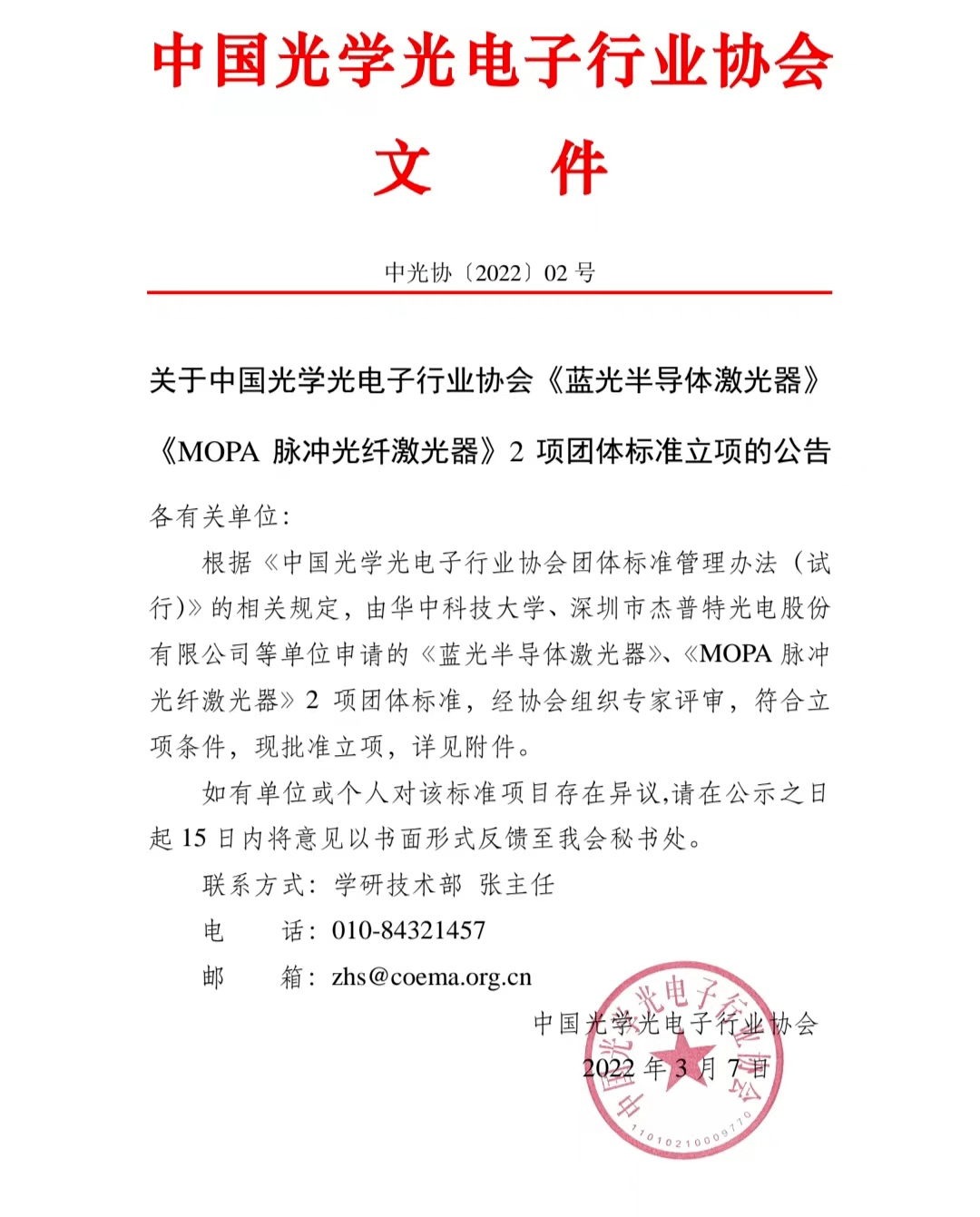 2022年3月,由杰普特牵头起草的《MOPA脉冲光纤激光器》团体标准,经过中国光学光电子行业协会组织专家评审之后,已经正式批准立项,对于进一步规范行业发展具有重要意义,有利于产业链上下游形成协同效益,做强做大产业!