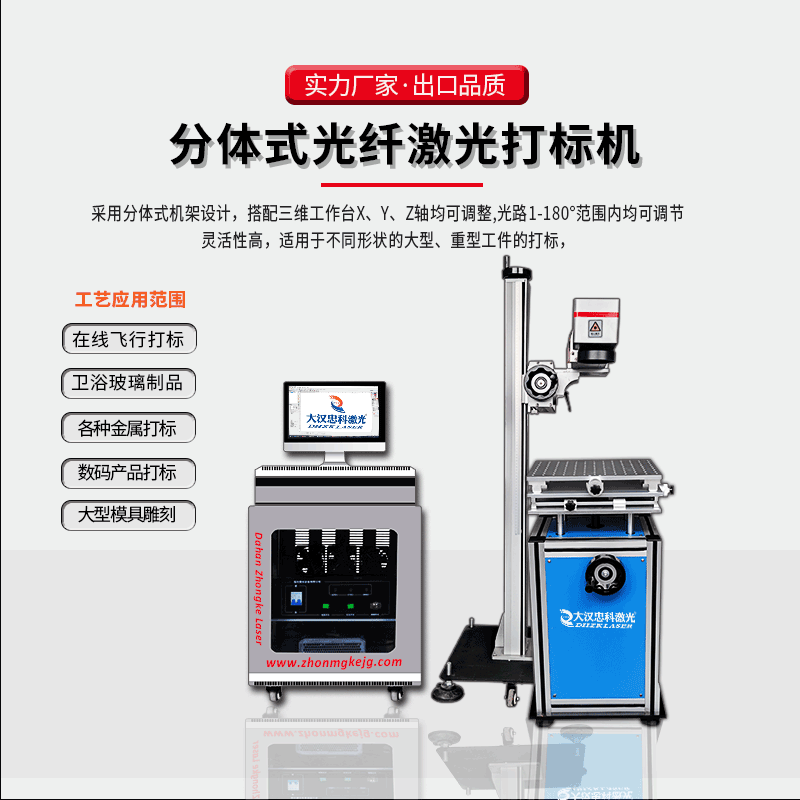 大汉忠科「分体式激光打标机」采用分体式机架设计,灵活性高,适用于不同形状的大型、重型工件的打标,也可配合用户现场的流水线进行在线打标。
