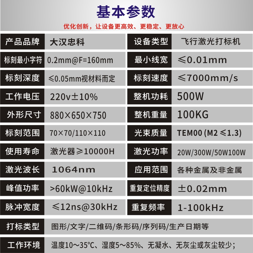 大汉忠科激光是国内激光打标机专业的生产厂家,旗下飞行激光打标机系列产品采用高品质光纤激光器、配以高速数字扫描振镜,性能达国际先进水平;可以轻松满足大部分常见自动化在线激光标记应用,诸如全自动传送带飞行打标、金属/非金属/塑料件/字符、文字图案、logo标记、二维码、条形码打标等。其通用型飞行光纤激光打标机光斑质量好,光斑密度均匀,有标准版、出口高配版等多种机型可选,价格实惠,欢迎咨
