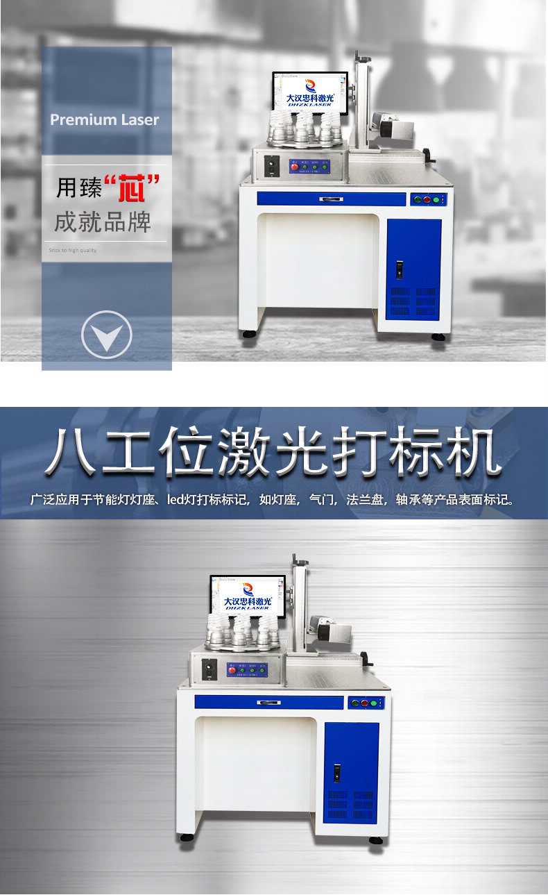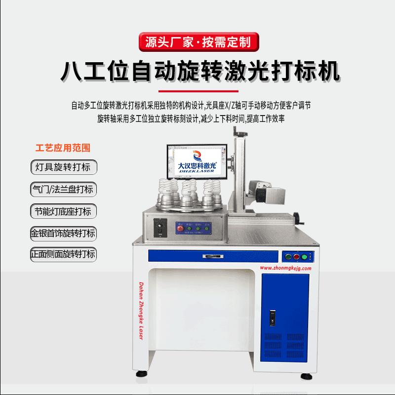 大汉忠科激光八工位光纤激光打标机,针对灯具、灯泡,分割四头8工位旋转转盘,可实现多工位自动旋转,切换及每个小夹头旋转打标,打标同时可人工上下料,提高加工效率;适用于球泡灯,LED灯,灯座等打标.八工位工作区配多维旋转,满足灯泡360°打标需求;XY移动平台区可满足普通平面打标需求。